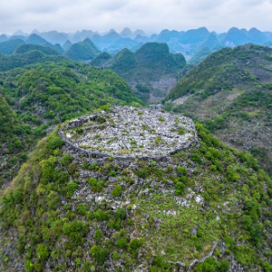 在贵州省兴义市敬南镇拢岸村附近有一处名为卢家营的村寨。据了解,在清代咸丰至同治年间,村寨旁的一座山头自然崩塌后形成一大块平面,村民们利用该平面在山顶修建防御设施抵御贼寇。如今,防御设施仅剩下部分防御营墙,留下的山头平整如刀切,宛若“消失”的山峰,令人称奇。
