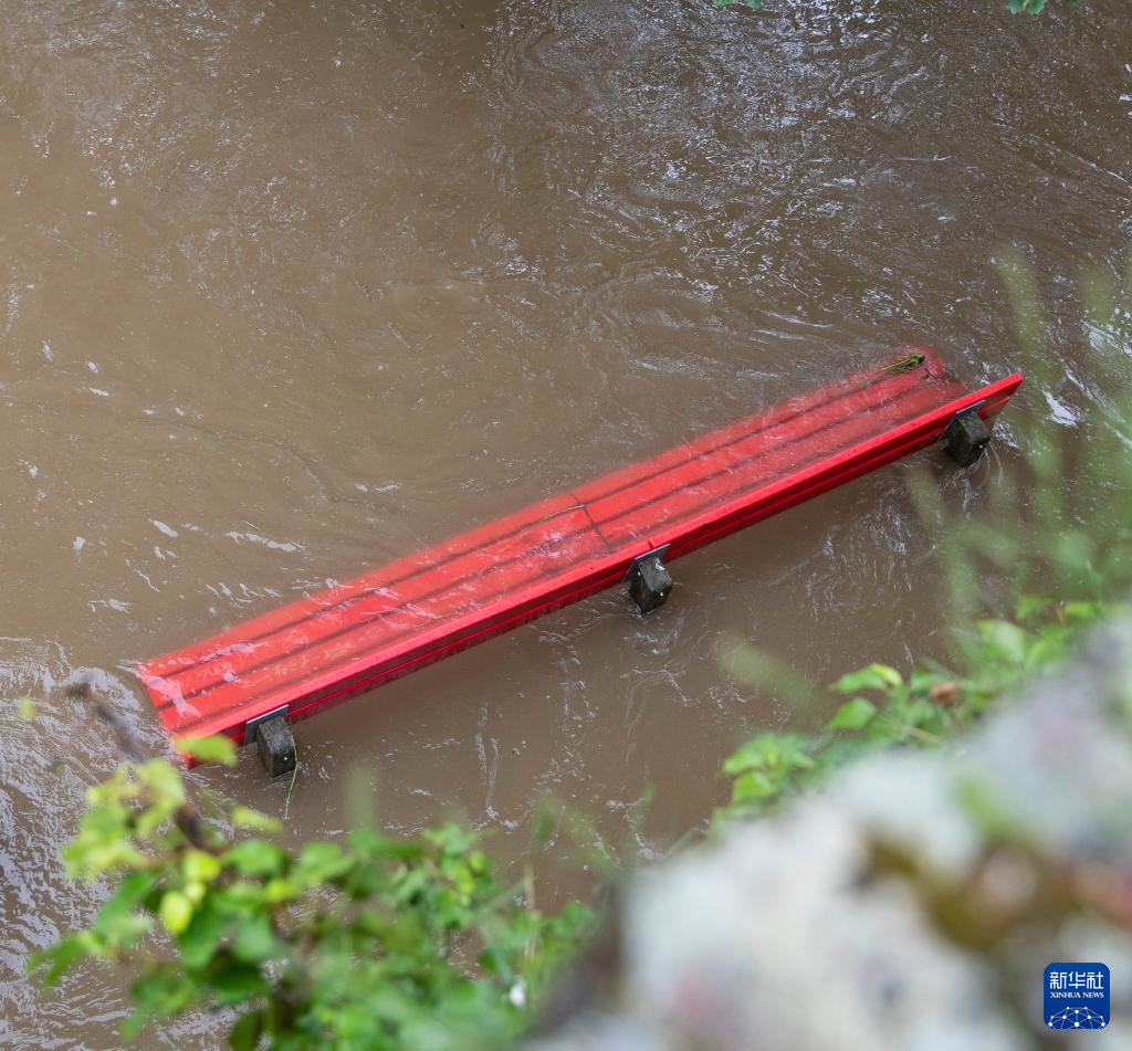 6月2日,在德国巴登-符腾堡州乌尔姆,水位上涨的多瑙河水部分淹没长椅。