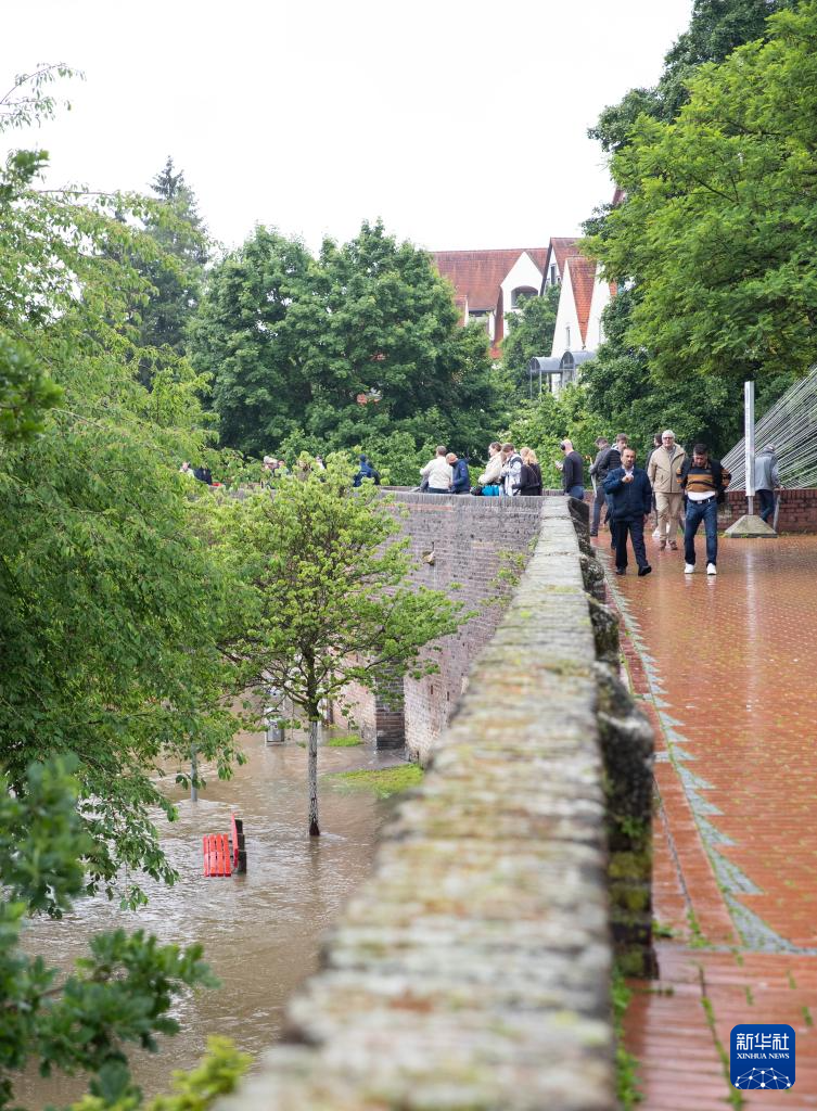 6月2日,在德国巴登-符腾堡州乌尔姆,人们站在城墙上观察洪水情况。