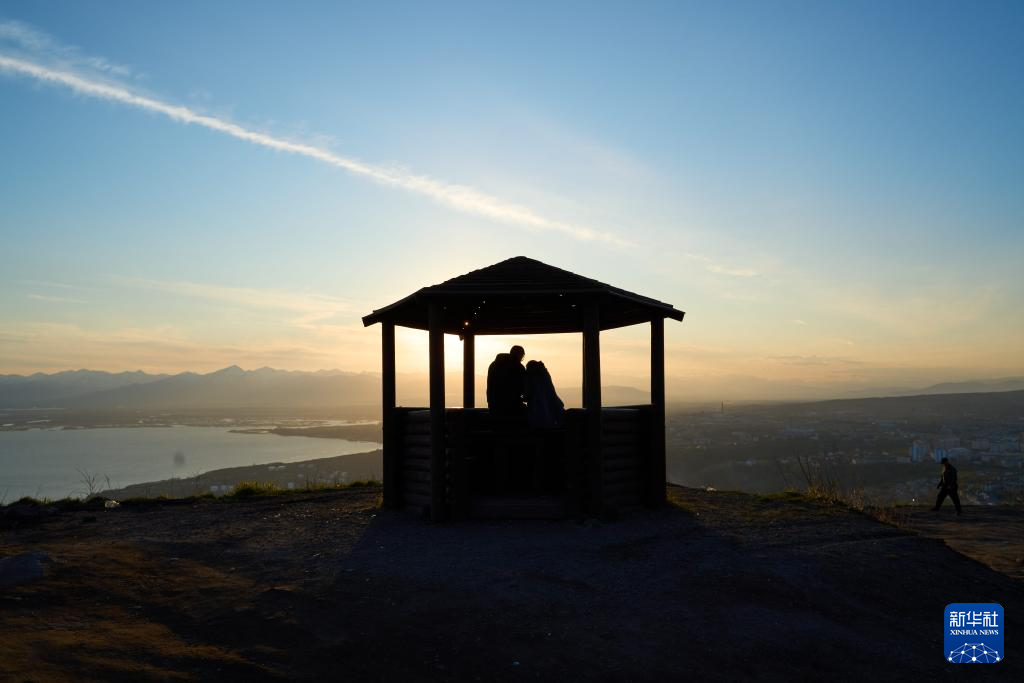6月2日,一对情侣在俄罗斯堪察加彼得罗巴甫洛夫斯克欣赏落日。