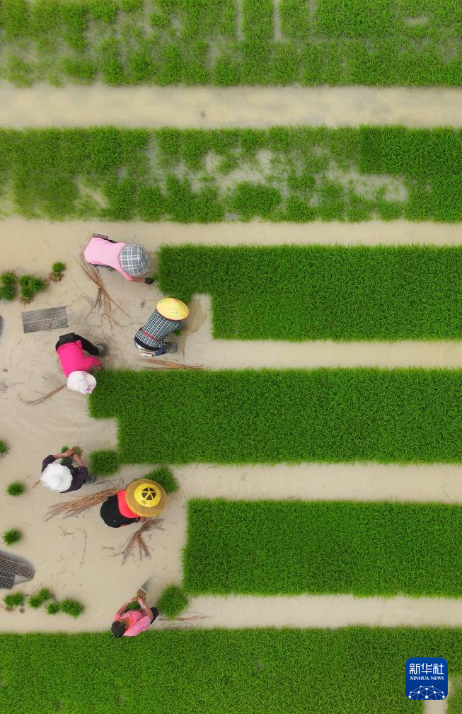 6月5日,江苏省连云港市灌云县下车镇顾圩村村民在水稻秧田里起秧。