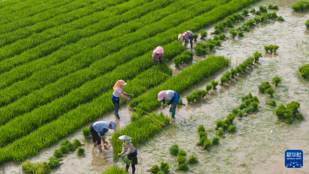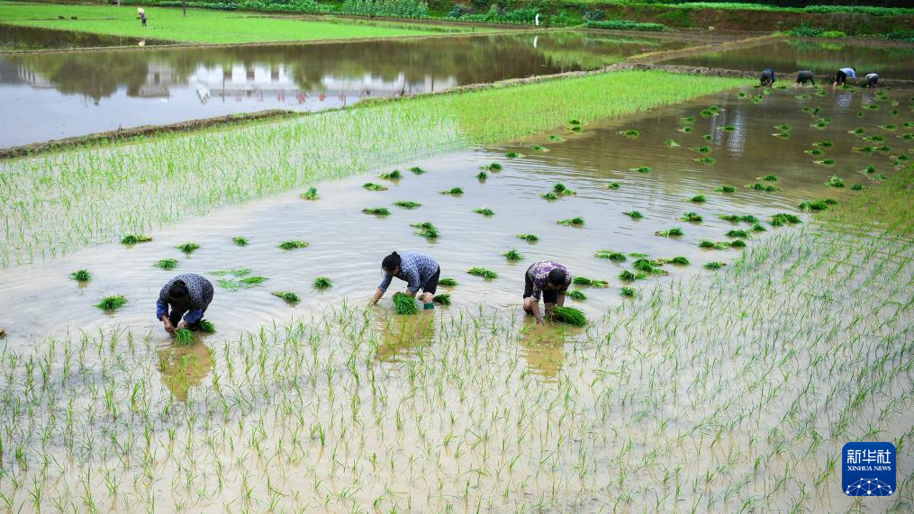 6月5日,农民在贵州省黔东南苗族侗族自治州岑巩县大有镇腊恰畈村田间起秧(无人机照片)。