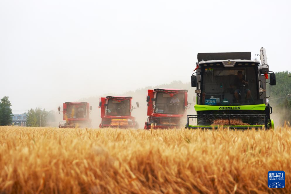 6月5日,山东省枣庄市峄城区古邵镇大刘庄村的农民驾驶收割机抢收小麦。