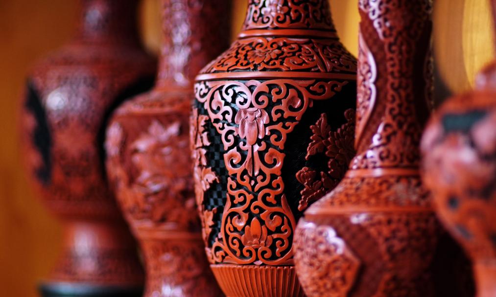 雕漆工艺是漆器胎上髹一定厚度的色漆,在漆上雕刻花纹的一种工艺,它的特点是工繁料贵、程序复杂、耗工繁巨、技艺高难。