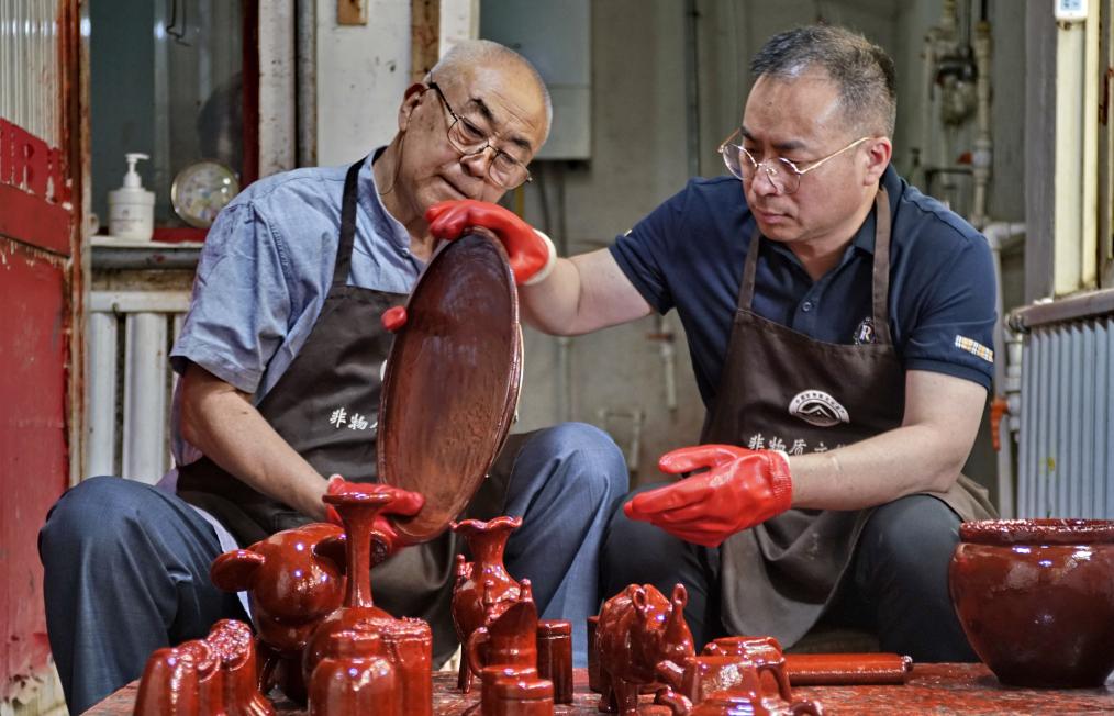 朱江(右)和父亲朱庆元在雕漆工作室研究髹漆过程中的问题(5月30日摄)。