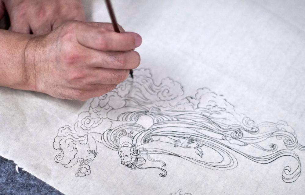 朱江在绘制雕漆作品线稿(6月5日摄)。