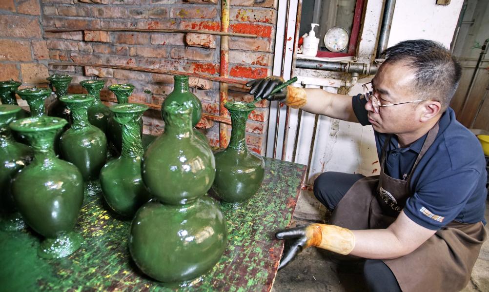 朱江在工作室为髹漆后的胎体绘制线稿(6月5日摄)。