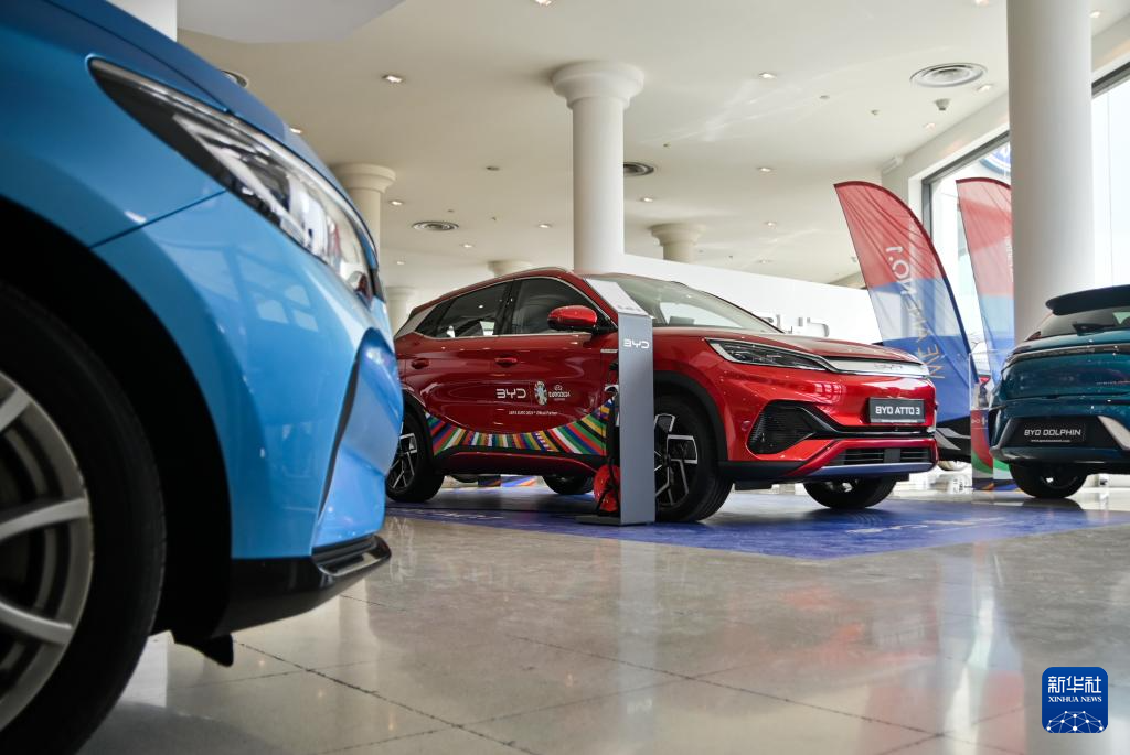 这是5月29日在马耳他比尔基卡拉拍摄的展示厅里的比亚迪纯电动汽车。