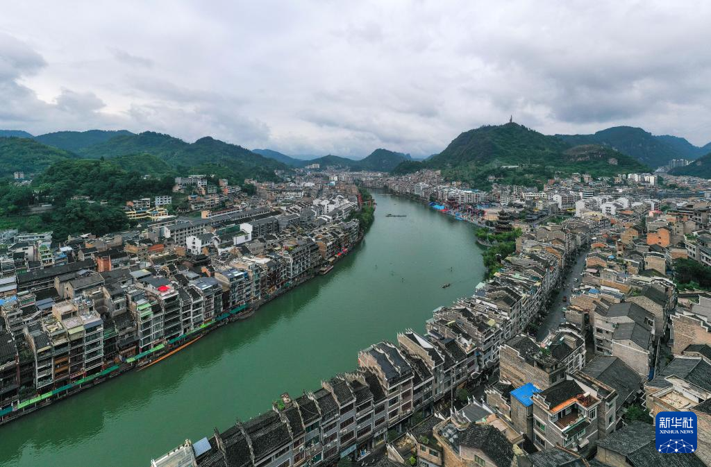6月12日,参赛队员在贵州省镇远县㵲阳河上进行独竹漂比赛(无人机照片)。