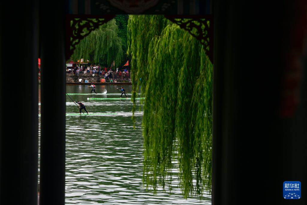 6月12日,参赛队员在贵州省镇远县㵲阳河上进行独竹漂比赛。