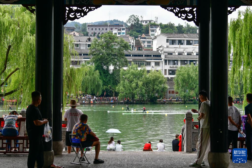 6月12日,人们在贵州省镇远县㵲阳河畔观看独竹漂比赛。