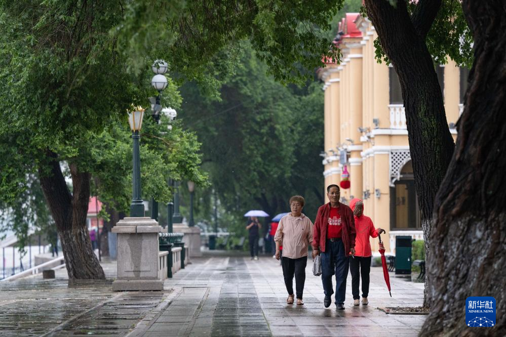 市民在哈尔滨松花江畔的斯大林公园散步(6月11日摄)。