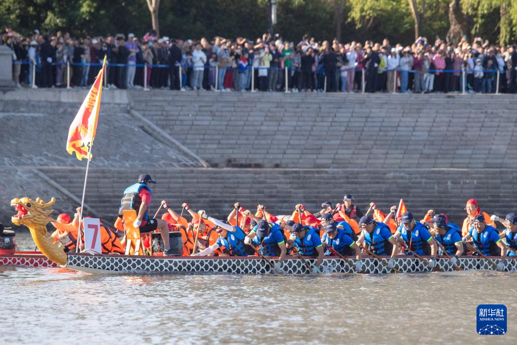 6月10日,选手在松花江哈尔滨市道里区段江面上参加龙舟比赛。