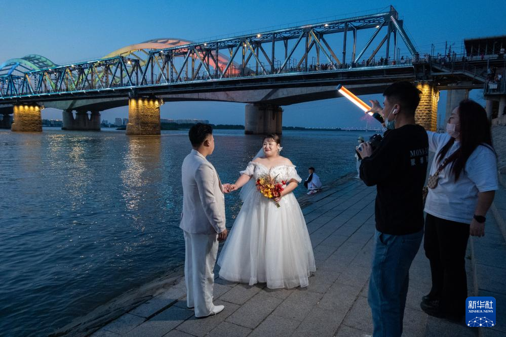 新人在哈尔滨市松花江畔拍摄婚纱照(6月4日摄)。