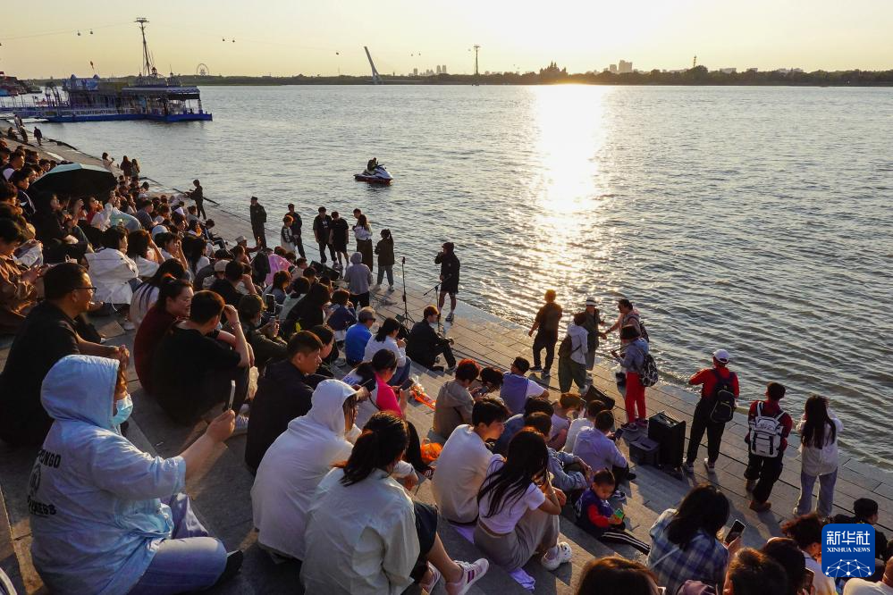 在哈尔滨市防洪纪念塔附近,人们在松花江畔吹江风、看日落(6月4日摄)。