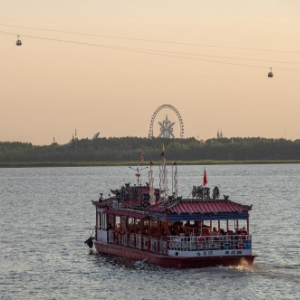 人们乘坐游船在哈尔滨市松花江上赏景游玩(6月4日摄)。