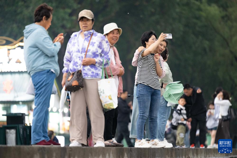 游人在哈尔滨市防洪纪念塔附近的松花江畔拍照(6月4日摄)。
