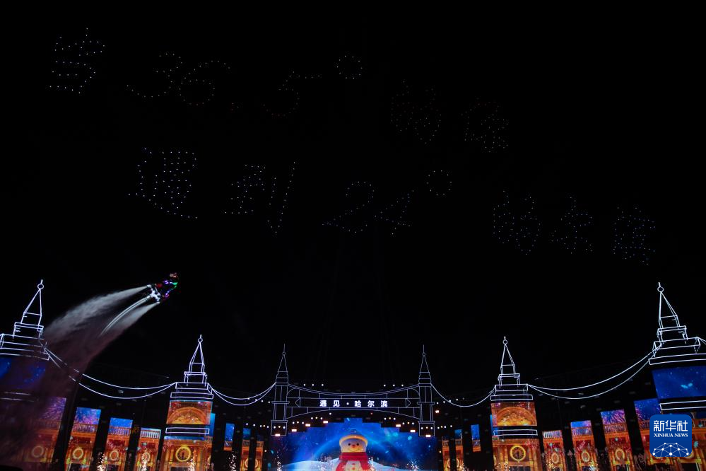 这是在松花江畔举行的《遇见·哈尔滨》演出现场(6月10日摄,无人机照片)。