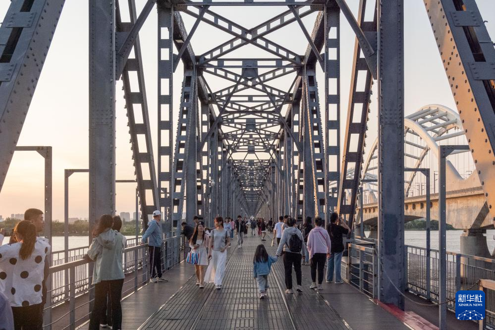 人们在哈尔滨市被称作“老江桥”的滨州铁路桥上游玩(6月4日摄)。