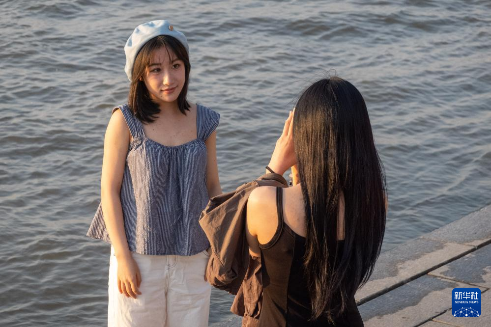 人们在哈尔滨防洪纪念塔附近的松花江畔拍照游玩(6月11日摄)。