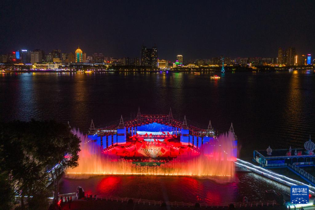 这是在松花江畔举行的《遇见·哈尔滨》演出现场(6月10日摄)。