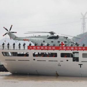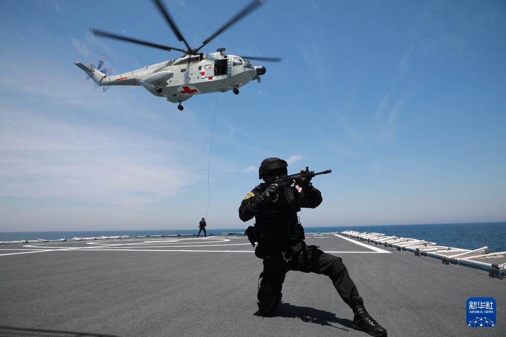 这是6月2日,中国海军“和平方舟”号医院船起航前组织反恐反海盗训练中,救护直升机前出。
