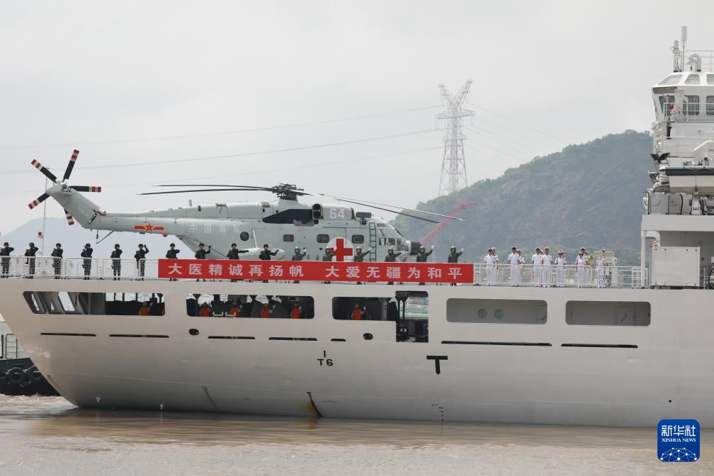 6月16日,中国海军“和平方舟”号医院船从浙江舟山某军港码头解缆起航,执行“和谐使命-2024”任务。这是任务官兵列队挥手告别。