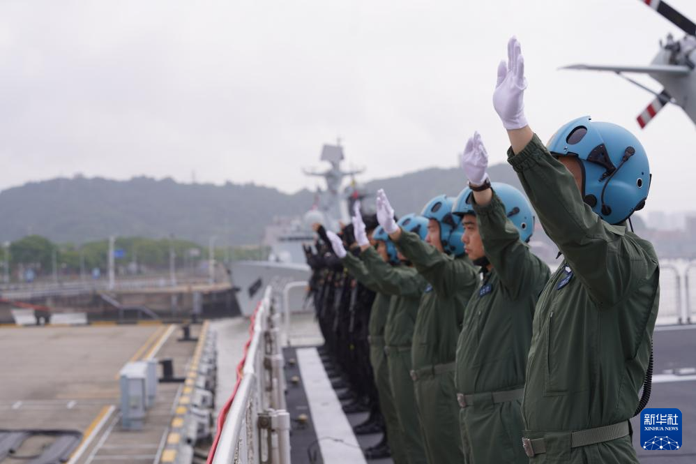 6月16日,中国海军“和平方舟”号医院船从浙江舟山某军港码头解缆起航,执行“和谐使命-2024”任务。这是任务官兵在挥手告别。