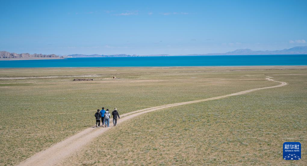 6月22日,游客漫步色林错湖畔。