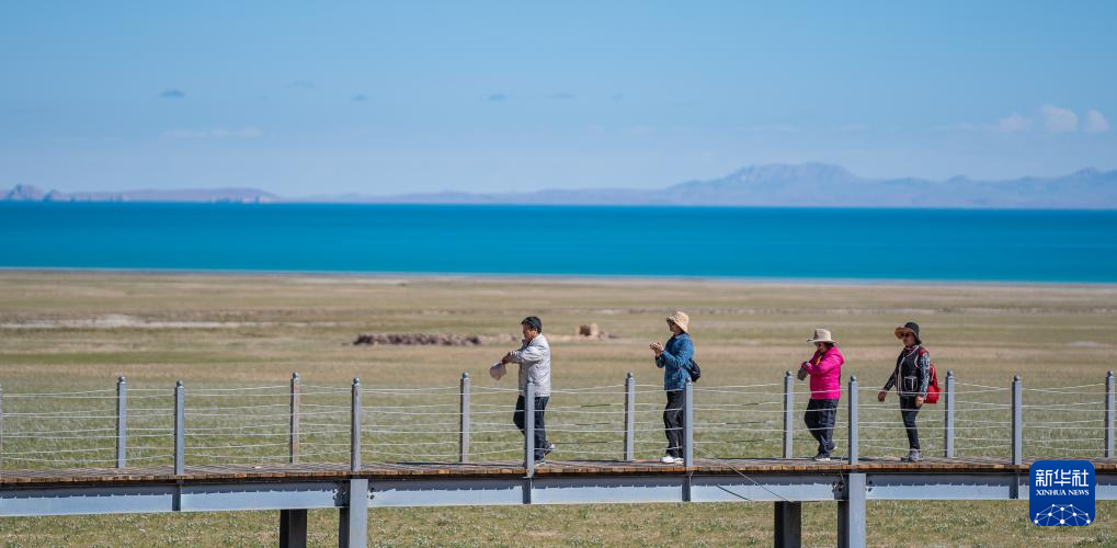 6月22日,游客在色林错湖畔的观景栈道上漫步。