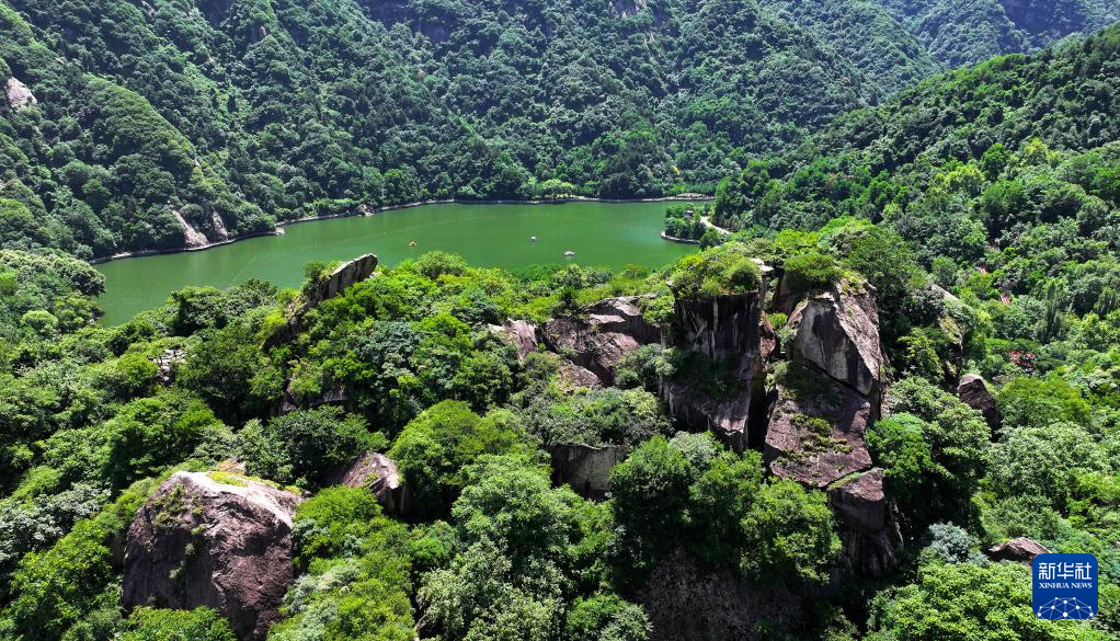 陕西省西安市翠华山景区绿树掩映下的崩塌石海和堰塞湖(6月24日摄,无人机照片)。