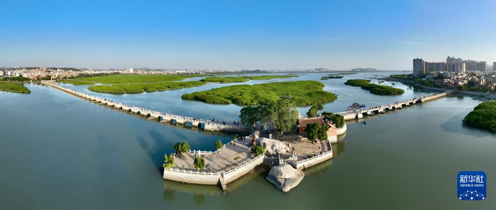 这是2023年11月19日拍摄的泉州洛阳桥(无人机照片)。洛阳桥位于福建泉州市区东北部的洛阳江上,原名“万安桥”,始建于北宋皇祐五年至嘉祐四年(1053-1059年),为我国现存最早的跨海梁式大石桥,代表当时中国先进的造桥技术。