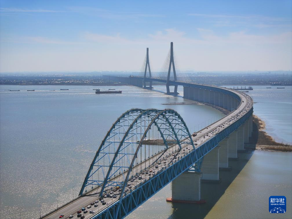 这是2024年2月16日在江苏南通拍摄的沪苏通长江公铁大桥(无人机照片)。2020年7月1日沪苏通长江公铁大桥正式开通,该桥是集合高速公路、客货混线铁路和高速铁路“三合一”的过江通道。