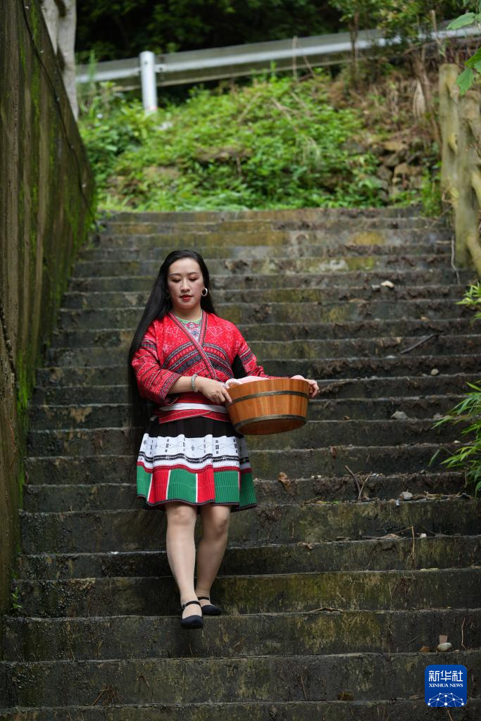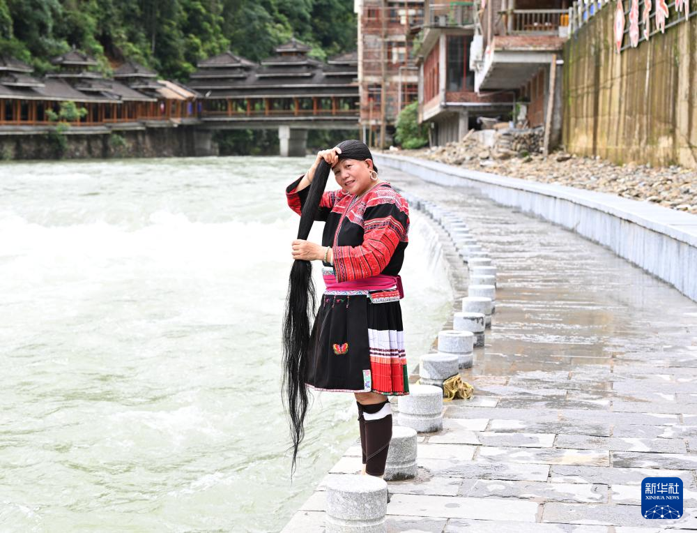 黄洛瑶寨村民潘秀香在金江河畔梳洗长发(6月26日摄)。