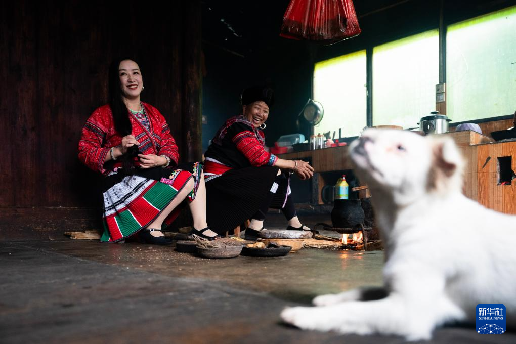黄洛瑶寨村民潘凤飞(左)在家中打理自己的长发(6月26日摄)。