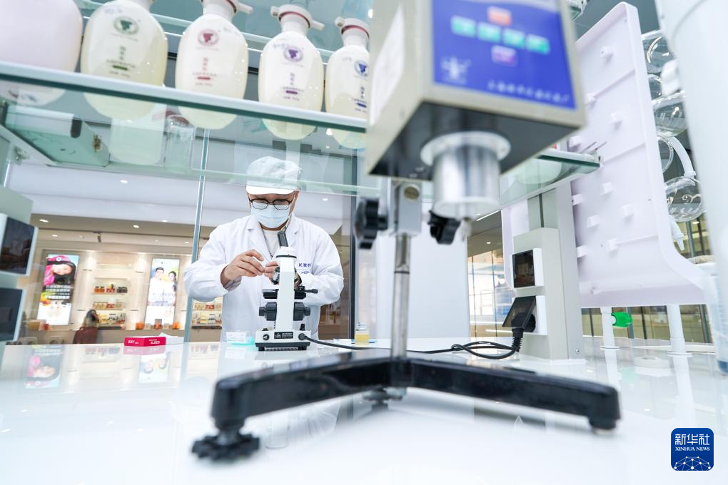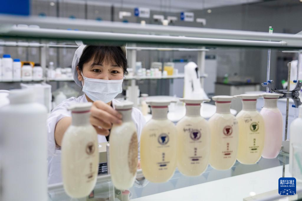在位于黄洛瑶寨的桂林长发小寨生物科技有限公司实验室,工作人员研制洗发水产品(6月26日摄)。