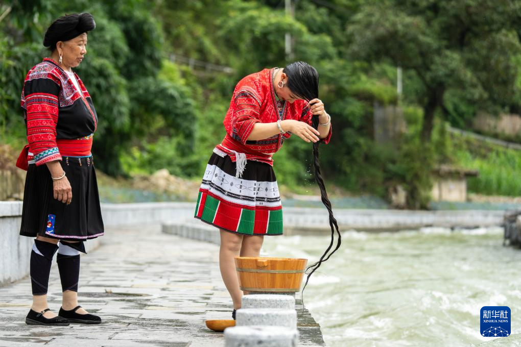 黄洛瑶寨村民潘凤飞(右)在金江河畔梳洗长发(6月26日摄)。