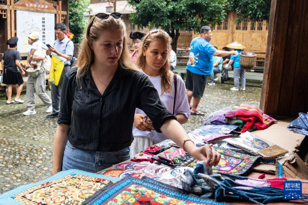 外国游客在黄洛瑶寨选购纪念品(6月27日摄)。