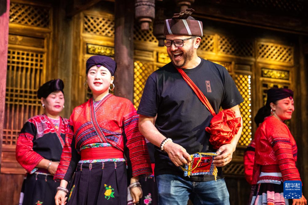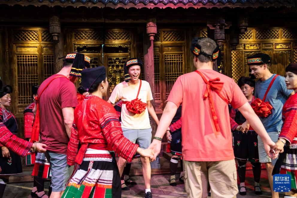 在黄洛瑶寨,外国游客与村民演员在红瑶民俗文化表演中互动(6月27日摄)。