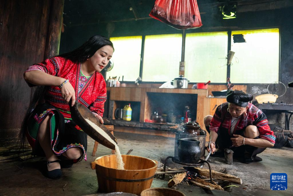 黄洛瑶寨村民潘凤飞(左)在家中制作洗发用的淘米水(6月26日摄)。