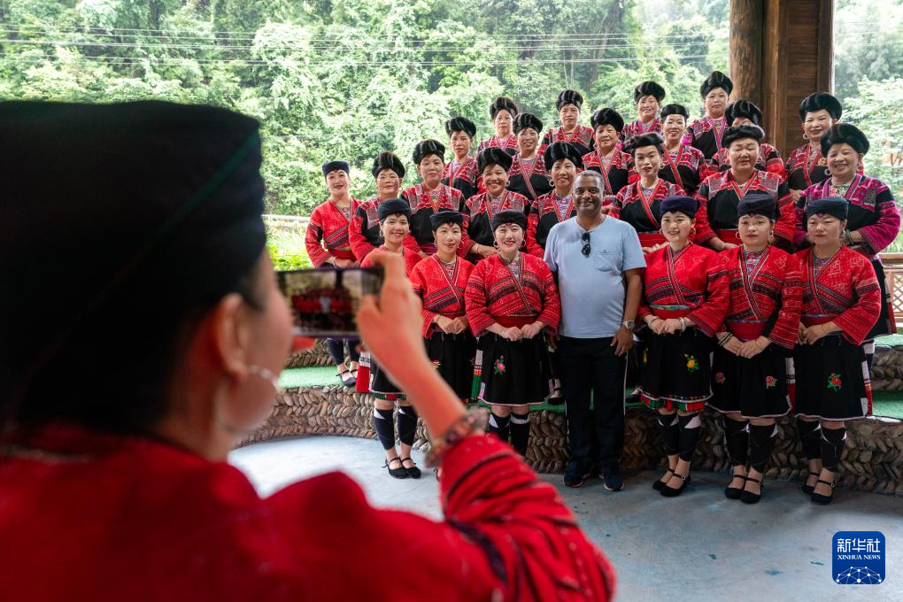 在黄洛瑶寨,一名来自埃塞俄比亚的游客观看红瑶民俗文化表演后与村民演员合影(6月26日摄)。