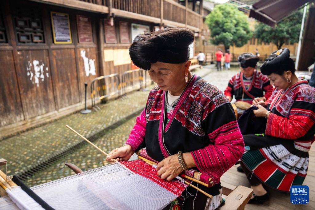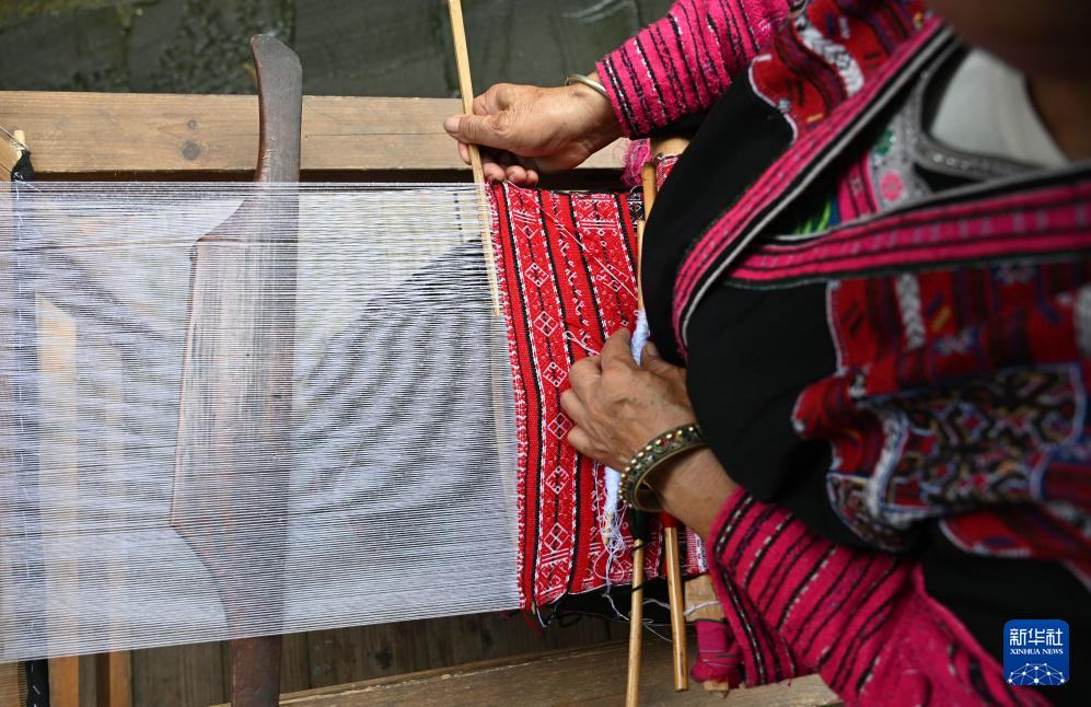 在黄洛瑶寨,国家级非遗瑶族服饰代表性传承人潘继凤在织布(6月26日摄)。
