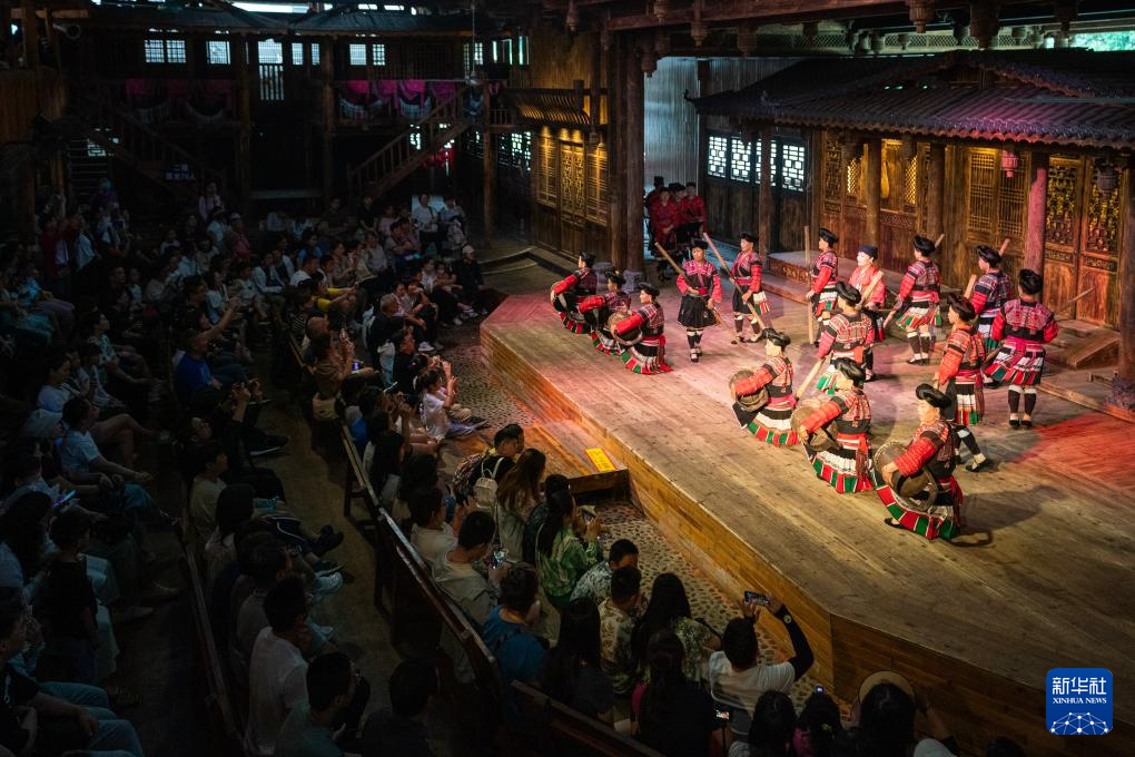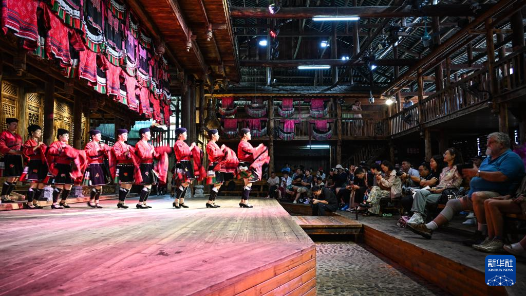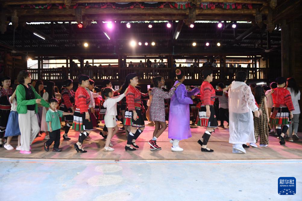 在黄洛瑶寨,国内外游客与村民演员在红瑶民俗文化表演中互动(6月26日摄)。
