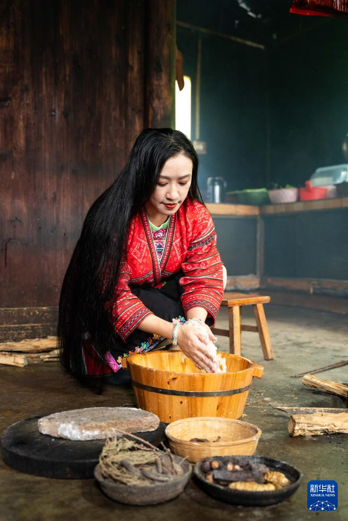 黄洛瑶寨村民潘凤飞在家中制作洗发用的淘米水(6月26日摄)。