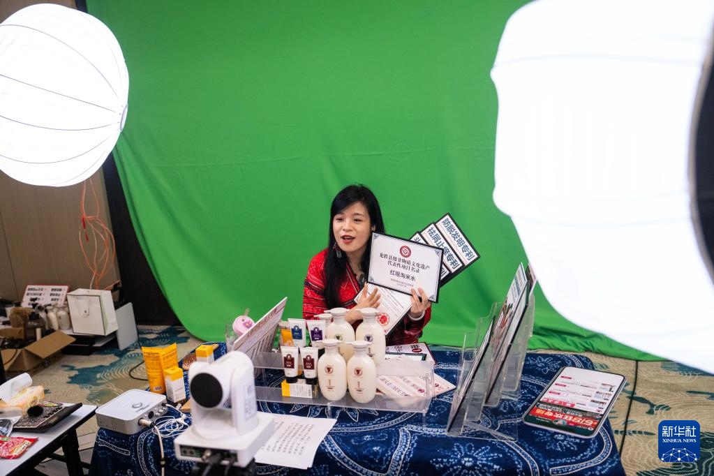 在位于黄洛瑶寨的桂林长发小寨生物科技有限公司,工作人员通过电商直播销售产品(6月26日摄)。