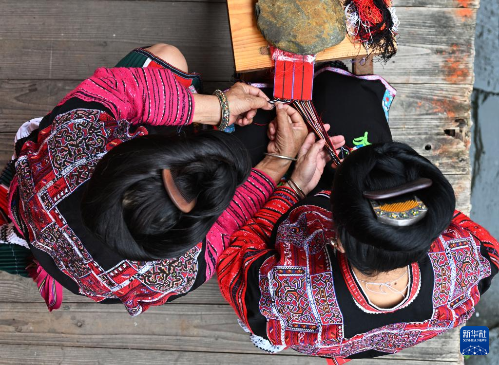 在黄洛瑶寨,国家级非遗瑶族服饰代表性传承人潘继凤(左)指导学徒编腰带(6月26日摄)。