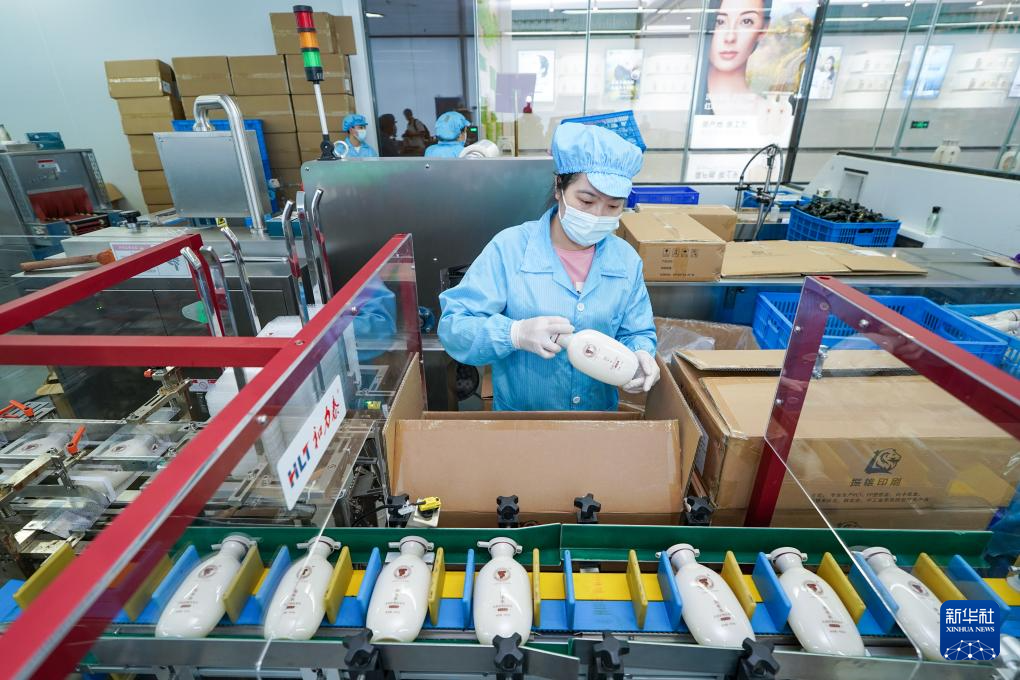 在位于黄洛瑶寨的桂林长发小寨生物科技有限公司生产线,工作人员包装洗发水产品(6月26日摄)。