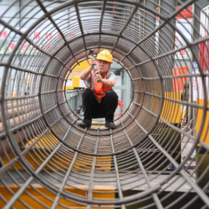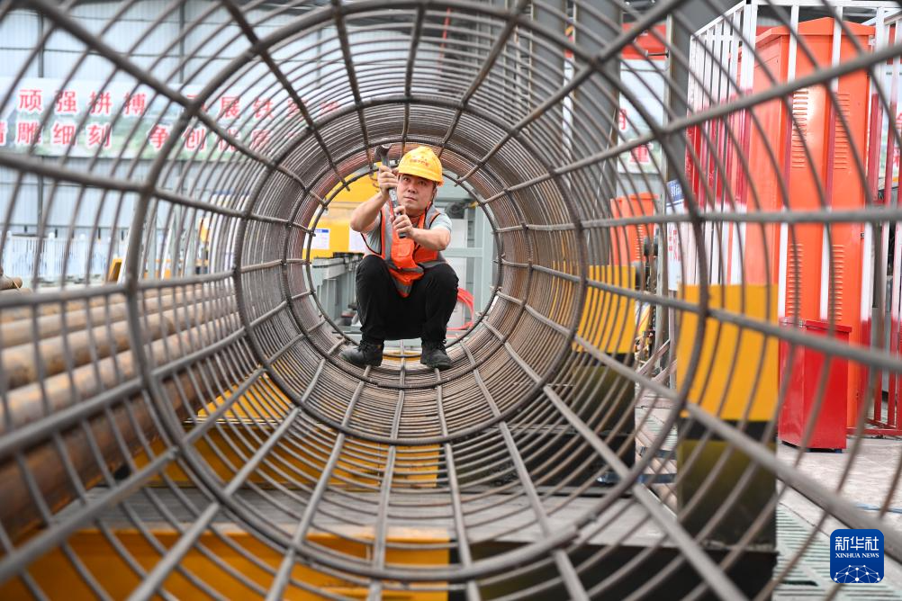 7月2日,在位于广西百色市凌云县的一处黄百铁路钢筋加工场,工人对焊接部位进行检查。