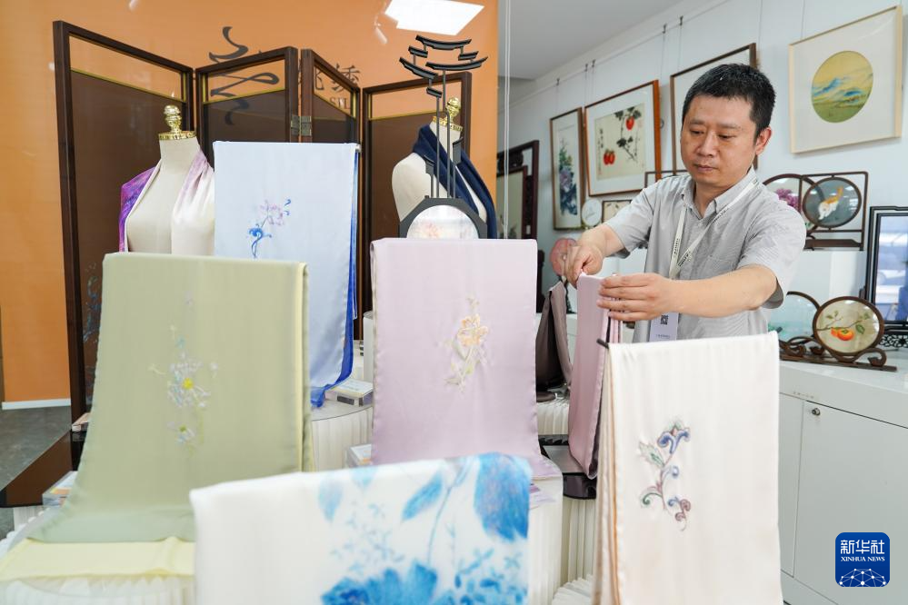 7月3日,在苏州高新区苏绣小镇一家苏绣产品门店,工作人员在整理苏绣产品。