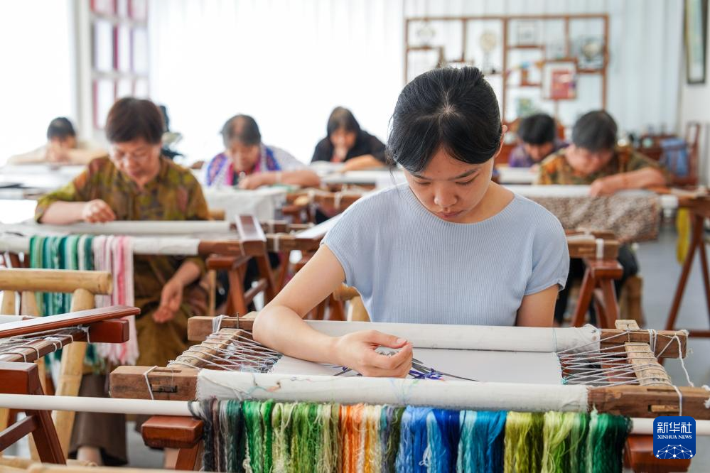 7月3日,在苏州高新区苏绣小镇里的一家苏绣工作室,绣娘们在加工苏绣产品。